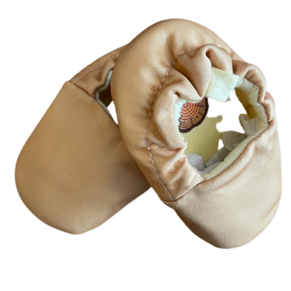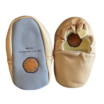 The only Eco-friendly moccasin of its kind. With eco-cotton on top and a nonslip vegan leather suede sole, they provide perfect protection and comfort for babies. They are handcrafted and elastic is wrapped under cotton around the heel to help provide support & stay on feet providing grip.