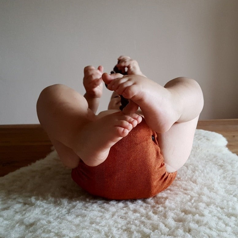 Puppi AI2 nappy shells are made of two layers of extremely soft and thin merino wool flannel. Colorful snaps and decorative stitching make it a conversation piece. The leg elastics are soft yet very stretchy, which allows for a trim fit on virtually every child. Once lanolised, these covers hold moisture very effectively. Wool is an extremely versatile fabric for cloth diapering-- it is breathable, temperature regulating (perfect for both cold and hot days), soft, and naturally antibacterial. Lanolin breaks down urine into salts and water, so it does not need to be washed as often as PUL diapers. Simply hang to dry between uses. However, a special washing and re-lanolising procedure is necessary on wash day.