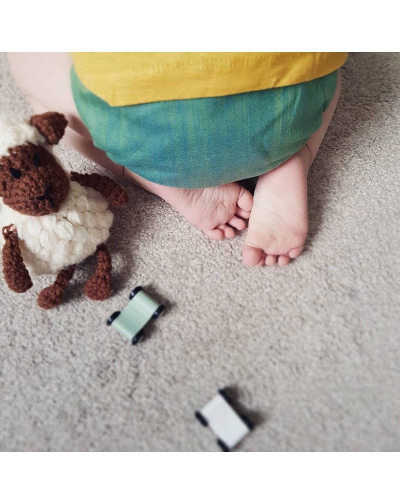 Puppi covers are made of two layers of extremely soft and thin merino wool flannel. Colorful snaps and decorative stitching make this a conversation piece. The leg elastics are soft yet very stretchy, which allows for a trim fit on virtually every child. Once lanolised, these covers hold moisture very effectively. Wool is an extremely versatile fabric for cloth nappies-- it is breathable, temperature regulating (perfect for both cold and hot days), soft, and naturally antibacterial. Lanolin breaks down urine into salts and water, so it does not need to be washed as often as PUL wraps. Simply hang to dry between uses. However, a special washing and re-lanolising procedure is necessary on wash day.